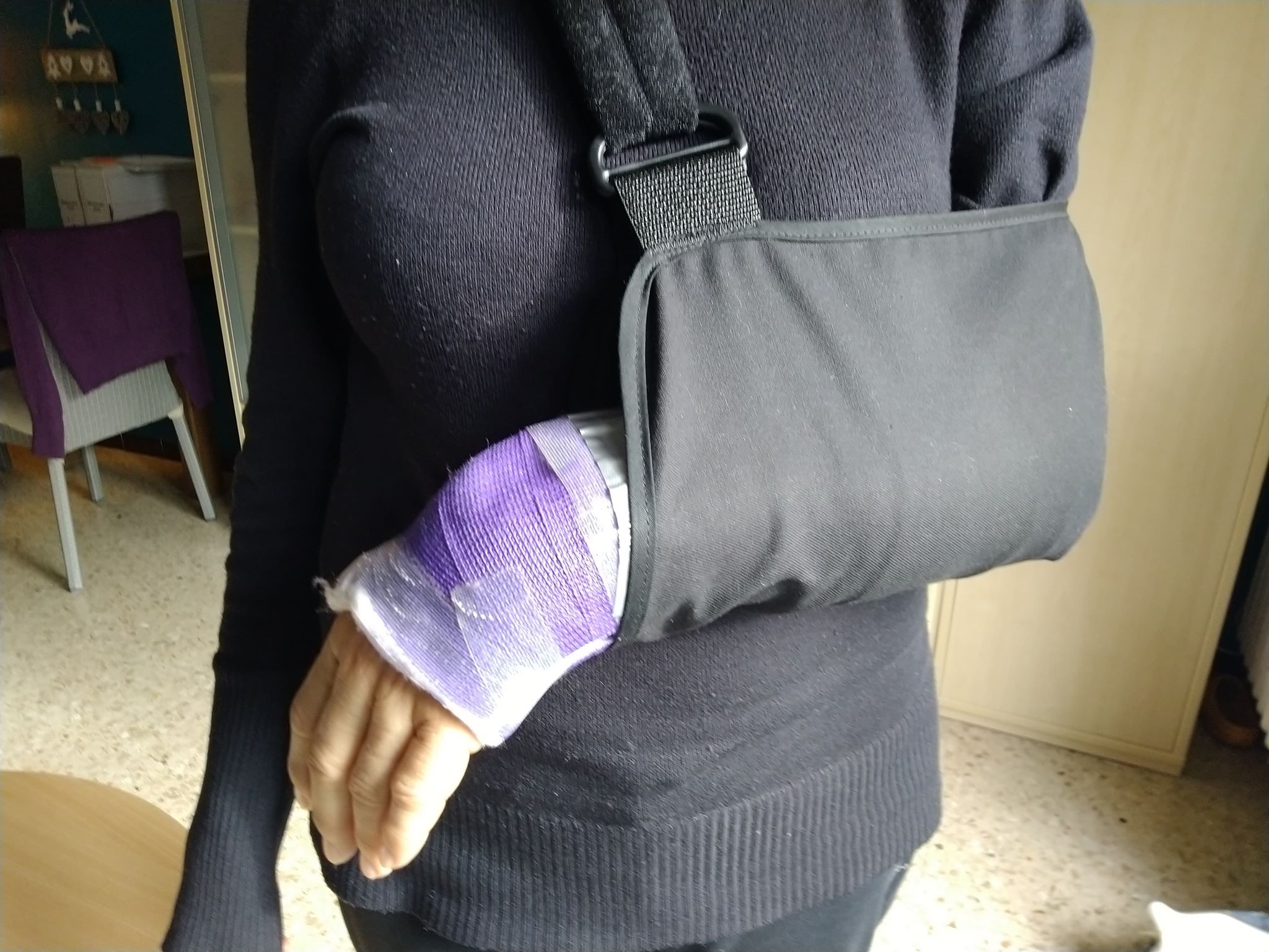 Je suis tombée sur le dos et le premier réflexe a été de mettre mon bras gauche en arrière pour me retenir. Malheureusement, mon poignet n'a pas supporté, résultat fracture angulaire et forte douleur dans le dos.