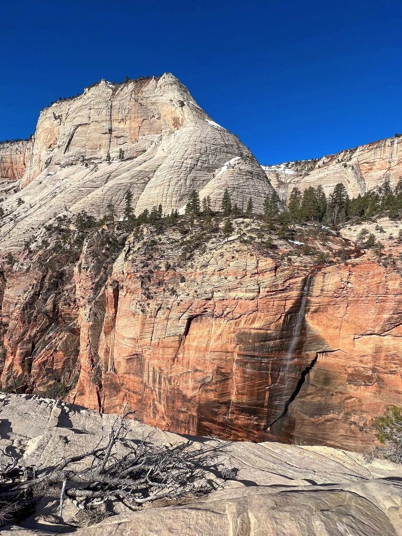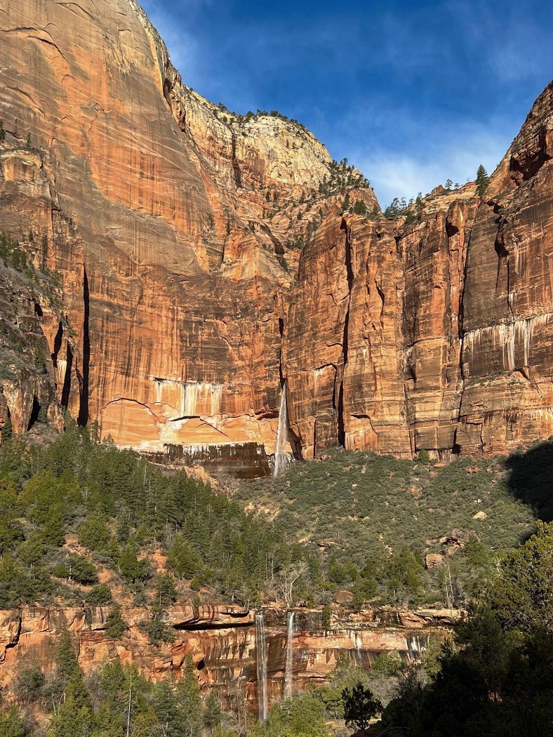 Le programme du jour était officiellement The Subway. J'avais obtenu le permis pour cette rando originale. Malheureusement, obligation de l'annuler à cause du niveau de l'eau... Pas grave !! Zion est plein de ressources !! Direction les Emerald Pools pour commencer ! Là, pour le coup, la météo des jours passés allait jouer en notre faveur. C'est la quatrième fois que je fais cette rando et elle n'a jamais été aussi belle ! J'ai même eu l'impression de la redécouvrir ! Beaucoup d'eau donc des cascades magnifiques !! On a adoré ! Puis direction The Watchman trail. Une rando qui vous fera prendre de l'altitude et vous donnera des points de vue superbes sur Zion. Direction Virgin, pour notre nouvel hébergement, le Zion White Bison Glamping.