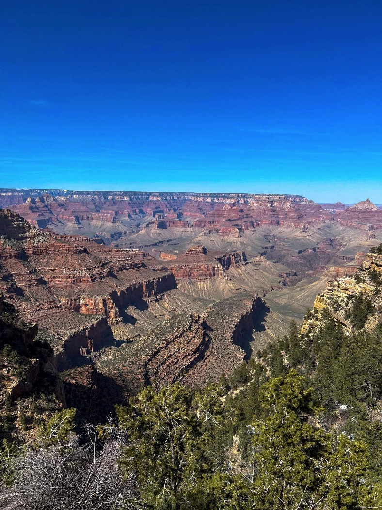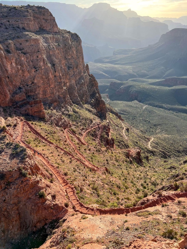 Pour Marjo, c'est le grand jour !! Si je l'ai déjà fait, pour elle c'est une grande première... Nous allons descendre dans les entrailles du Géant de l'Arizona !! 4h du matin, température négative, nous prenons la route en direction du Visitor Center... Embarquement dans la navette et direction le South Kaibab trail. Comme on dit, quand faut y aller, faut y aller... Et c'est parti pour un peu plus de 10 km de descente enchaînés avec 14 km de remontée... Nous ne sommes qu'en avril et je peux déjà vous dire qu'il faisait chaud !! Au bout de 7h20 nous atteindrons les derniers mètres du Bright Angel trail. Je suis fier de ma Wonder Woman !! Elle m'avoue que c'est la plus dure rando qu'elle ait faite de sa vie !! Mais assurément la plus belle !!