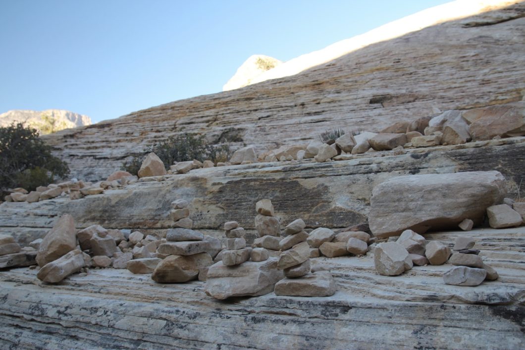 Il n'y a pas de sentier à proprement parlé, il vous suffit de suivre les traces laissées dans le grès, les quelques cairns (petits monticules de cailloux vous permettant de vous repérer), mais il n'y a rien de compliqué, le chemin se trouve facilement.