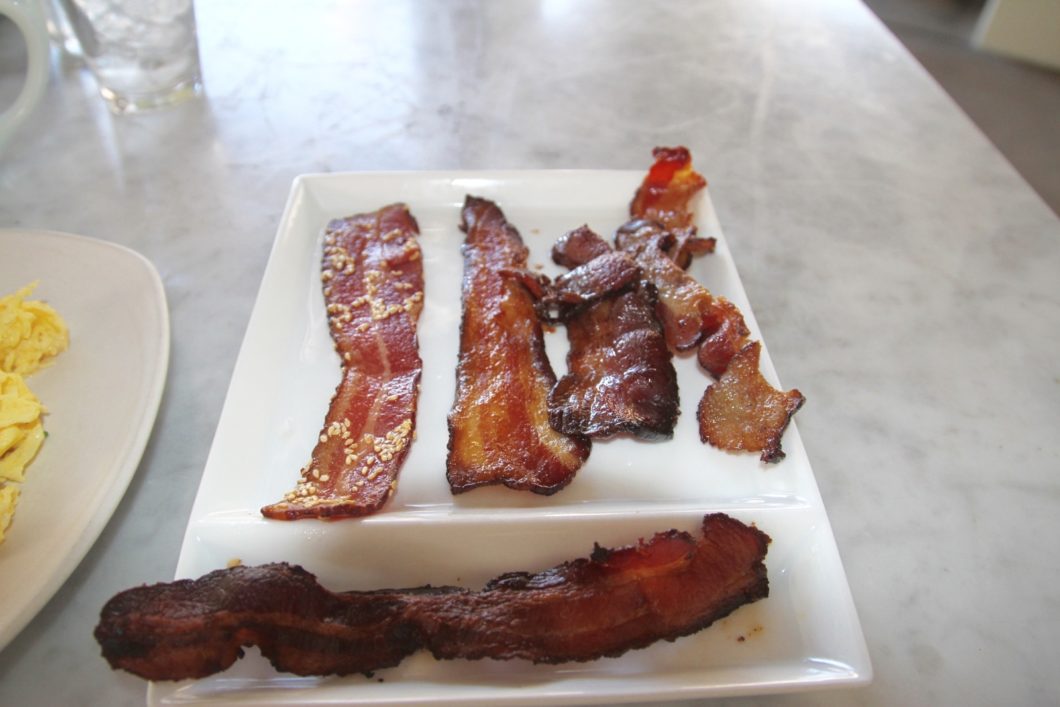 Cependant, la spécialité maison est "The bacon flight", une assiette composée de 5 tranches de bacon préparées de façon différentes que vous dégusterez un peu comme une assiette de fromage, en allant du plus doux au plus fort. Un véritable voyage culinaire avec du bacon fumé au bois de pommier, parfumé à la cannelle ou encore du bacon au piment jalapeno (piment mexicain).