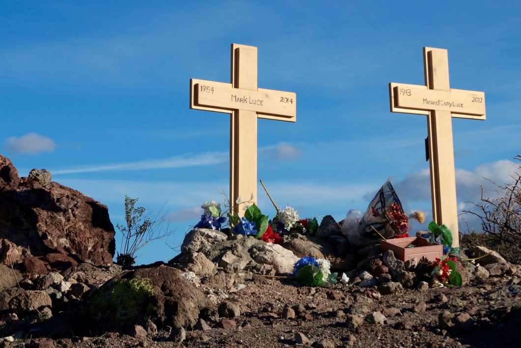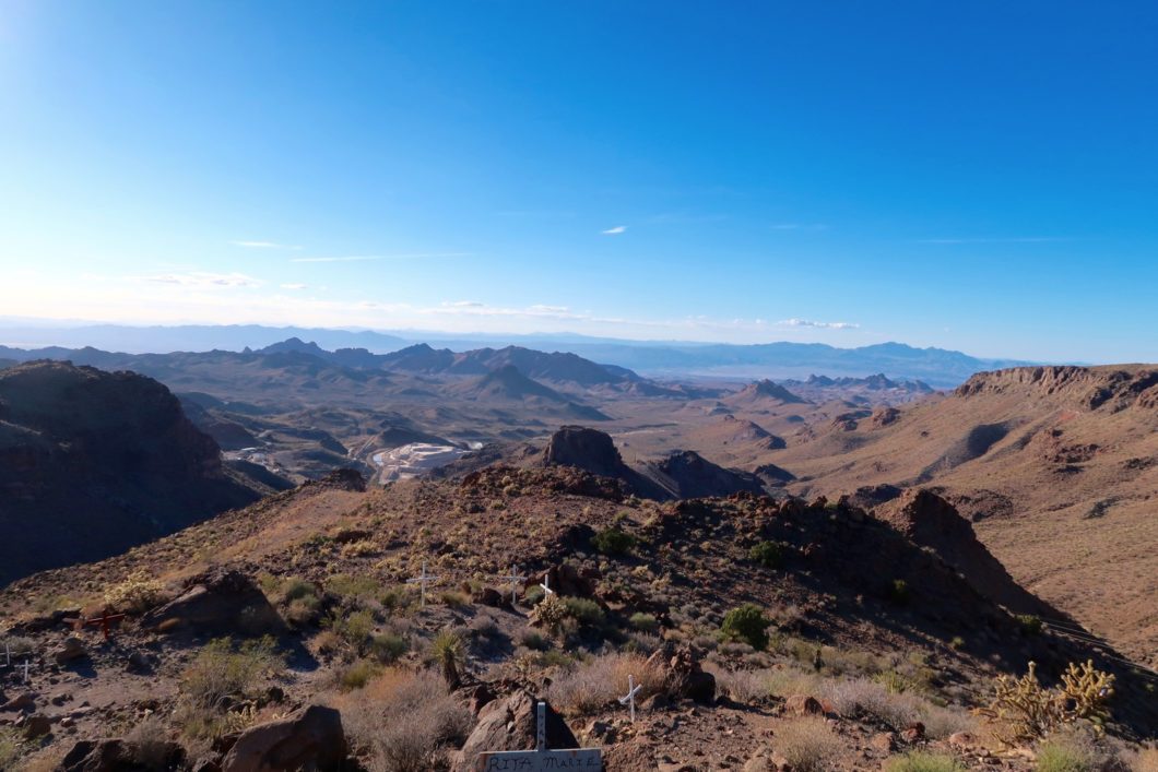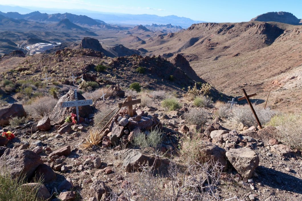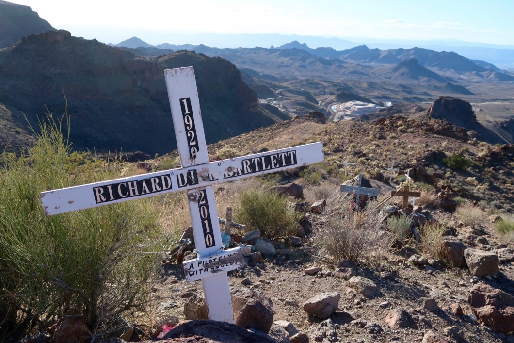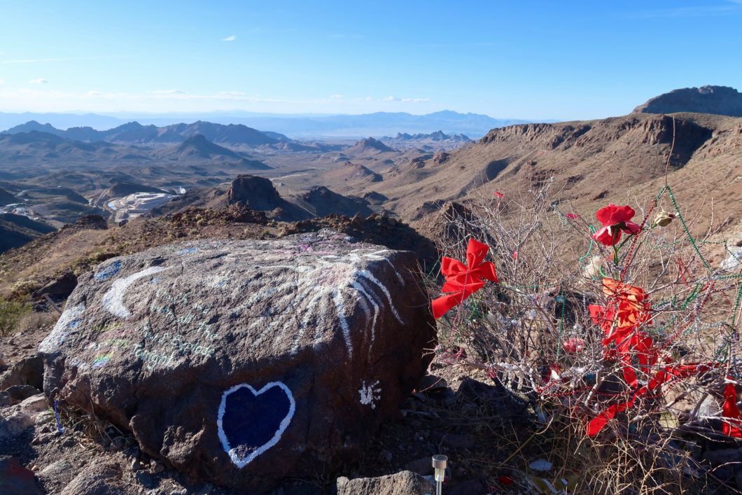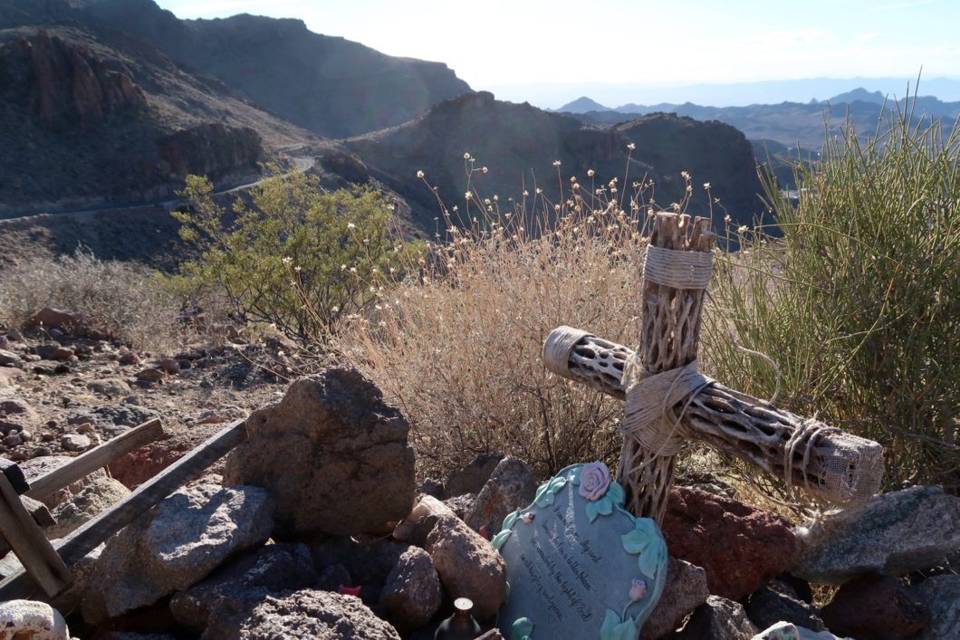 En arrivant d'Oatman, quelques mètres avant le panneau indiquant que vous venez de franchir la Sitgreaves Pass, vous trouverez un immense parking sur votre gauche. Il faudra impérativement vous y arrêter, aller tout au bout afin de voir ce qui de prime à bord ressemble à un cimetière mais qui est en fait une sorte d'immense mémorial avec des croix ou autres reliques en hommage à un être cher, disparu ou même à un animal de compagnie. C'est assez impressionnant et vaut la peine d'être vu. Il s'agit du Parc commémoratif Murals and Mémorial.