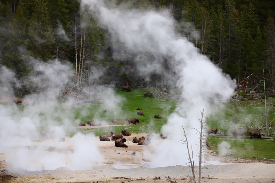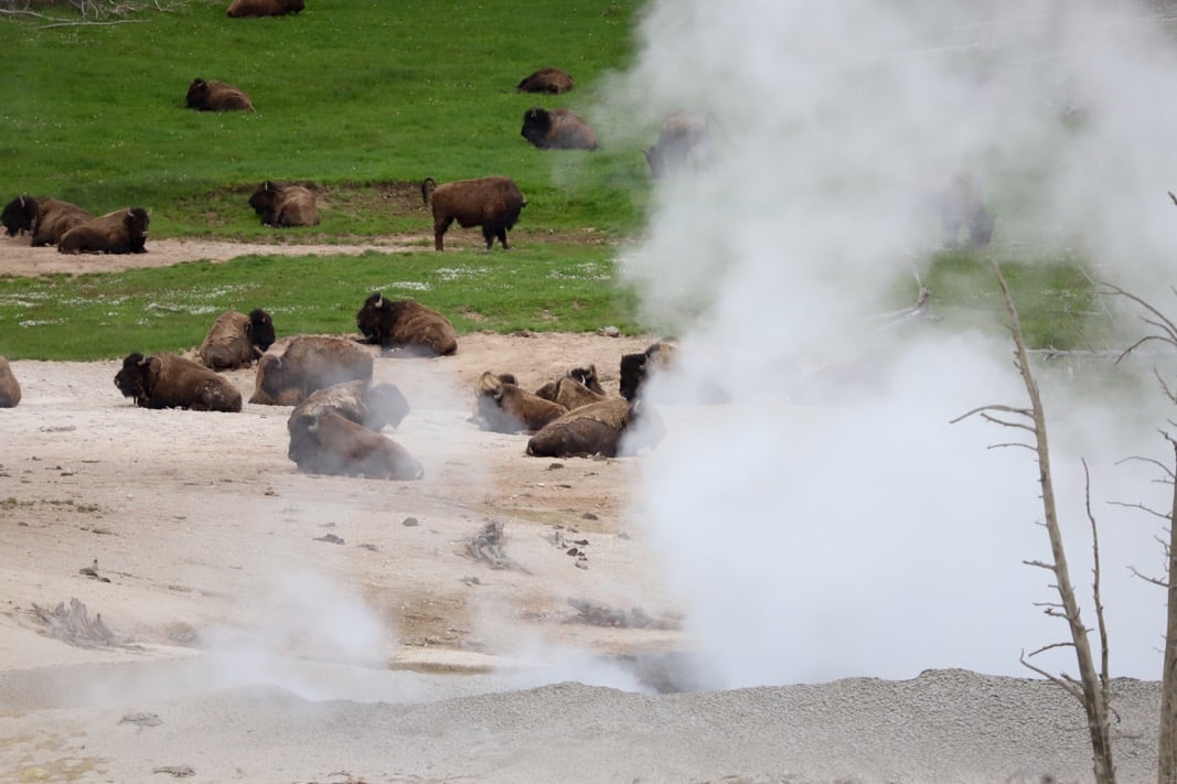 Un conseil, tôt le matin ou tard le soir. En effet, les bisons adorent passer la nuit près des zones géothermiques en dormant au pied des sources chaudes. Vous verrez souvent des traces de leurs passages avec des traces de sabots ou des popos de bisons. 😉