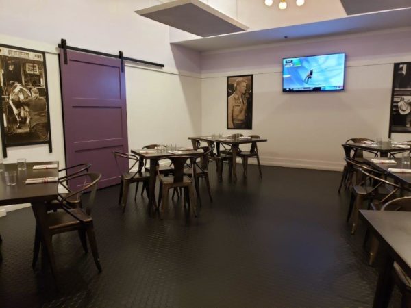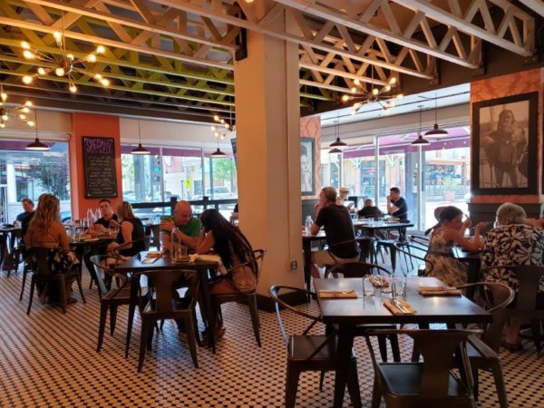 Le restaurant a des allures de bistro avec son carrelage, petite tables et chaises en fer.