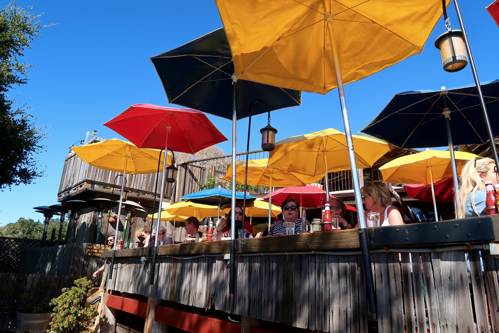 La terrasse est immense et sur toute la longueur, vous avez de longues tables sur lesquelles vous mangez côte à côte et, face à vous, le Pacifique à perte de vue.