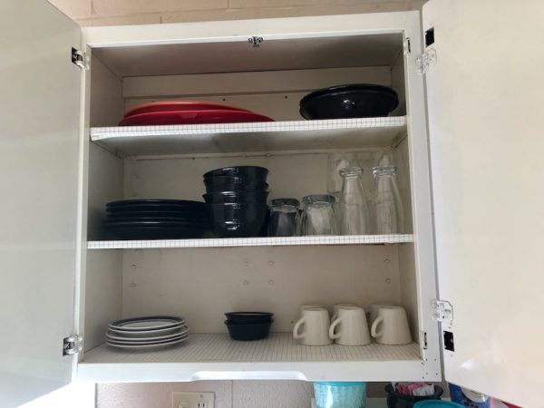 Dans les placards, tout le nécéssaire pour manger et cuisiner.
