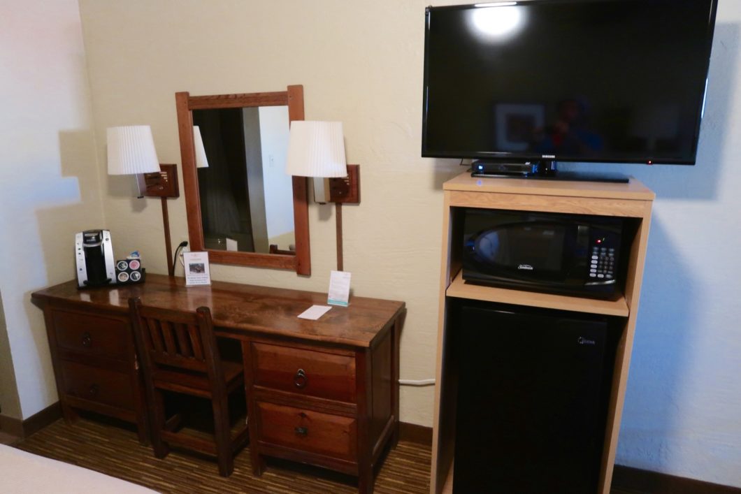 La chambre est assez spacieuse et dispose de tout l'équipement classique et pratique que l'on peut rencontrer dans de nombreuses chambres dans l'Ouest, à savoir un frigo, un four micro-ondes, une machine à café, etc.