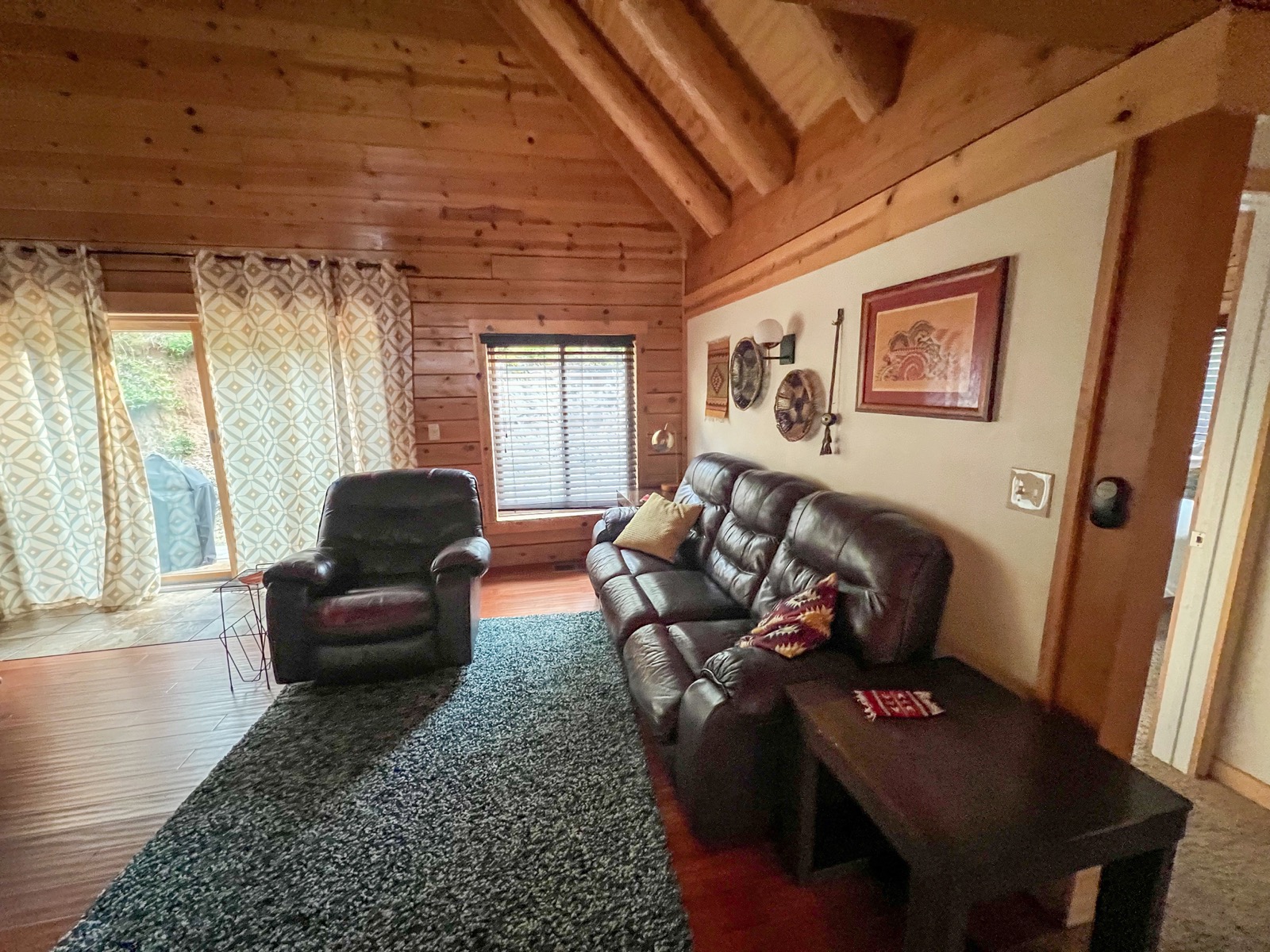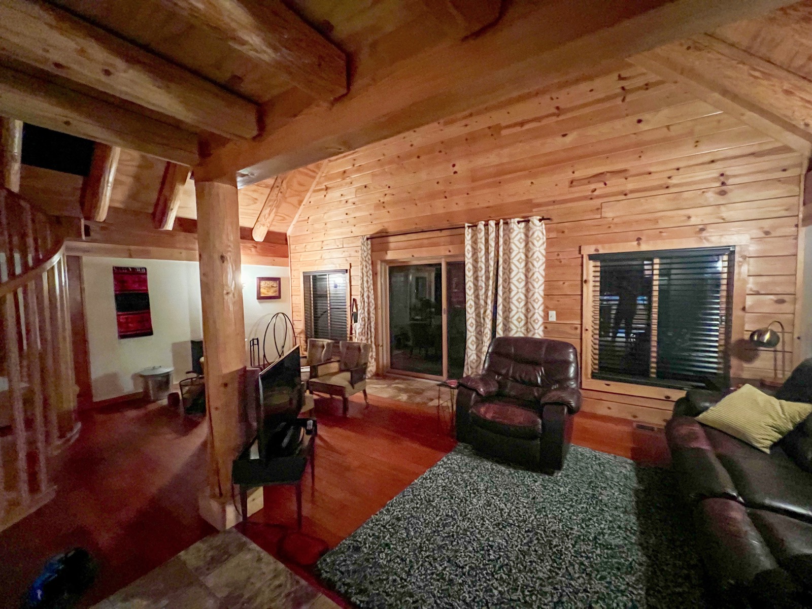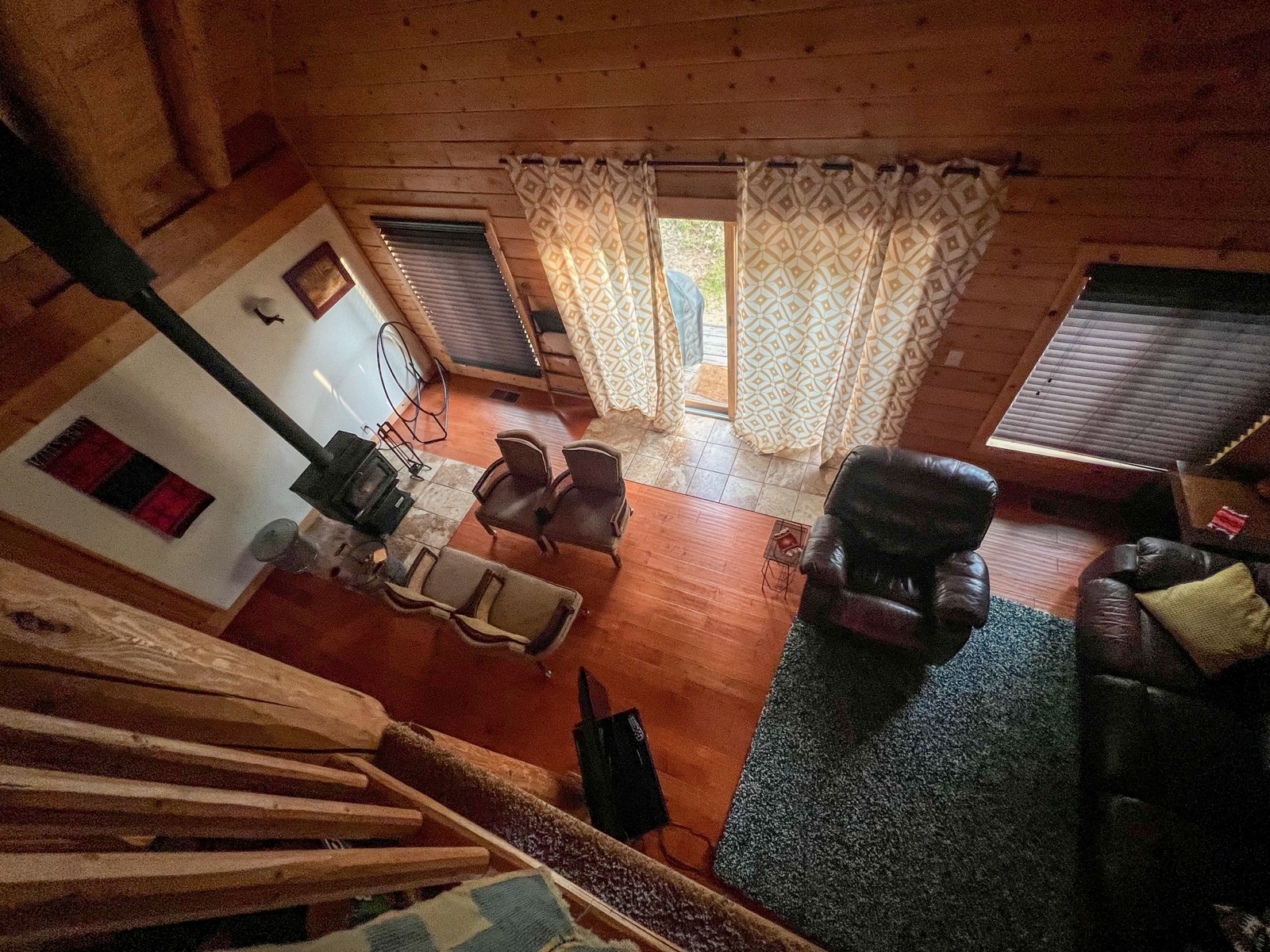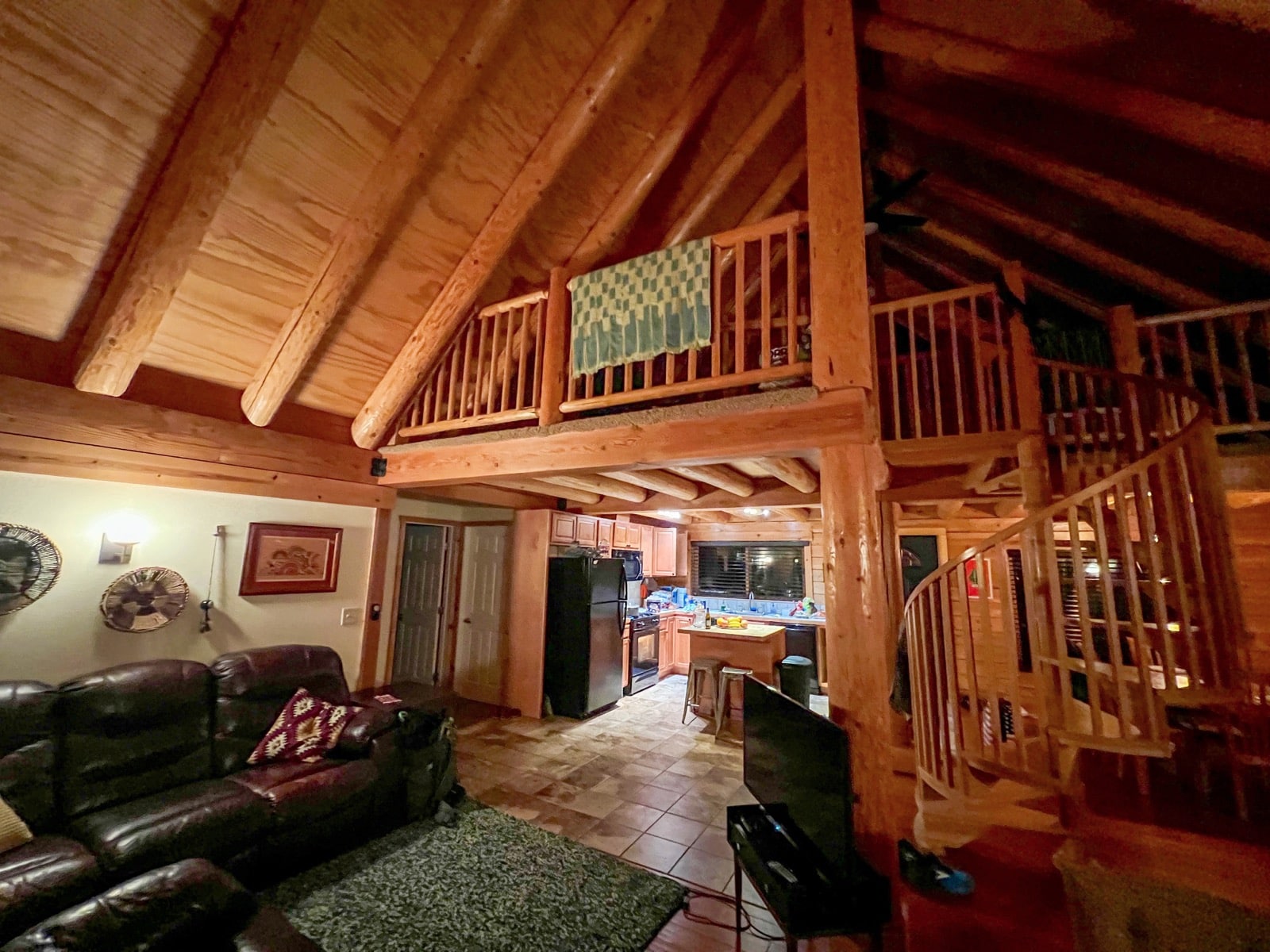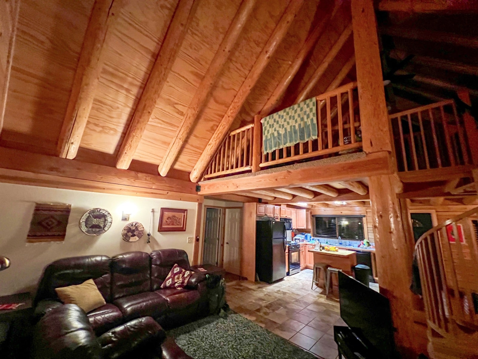 Et la magie se poursuit à l'intérieur. Parfois, extérieurement c'est superbe et le charme retombe une fois la porte ouverte... Ici, ce n'est pas le cas. L'intérieur est tout en bois avec de grands et beaux espaces. Un immense salon séjour cuisine, des chambres de parts et d'autres et une belle mezzanine au-dessus. C'est décoré avec goût et là encore, pas de doute, le Yosemite n'est pas loin !!
