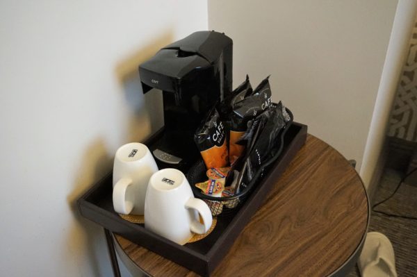 Ensuite on retrouve tout le nécessaire d’une chambre d’hôtel avec une TV à écran plat, une cafetière, une petite table.