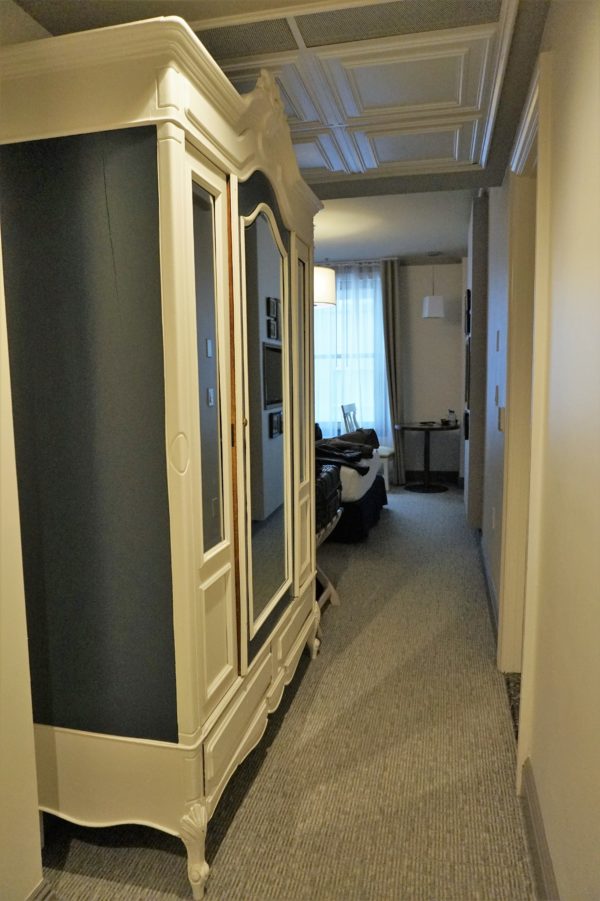 Nous avons simplement logé dans une Superior Queen Room de taille normale. Dans le long couloir à l’entrée il y a une grande armoire avec beaucoup d’espace pour ranger ses affaires.