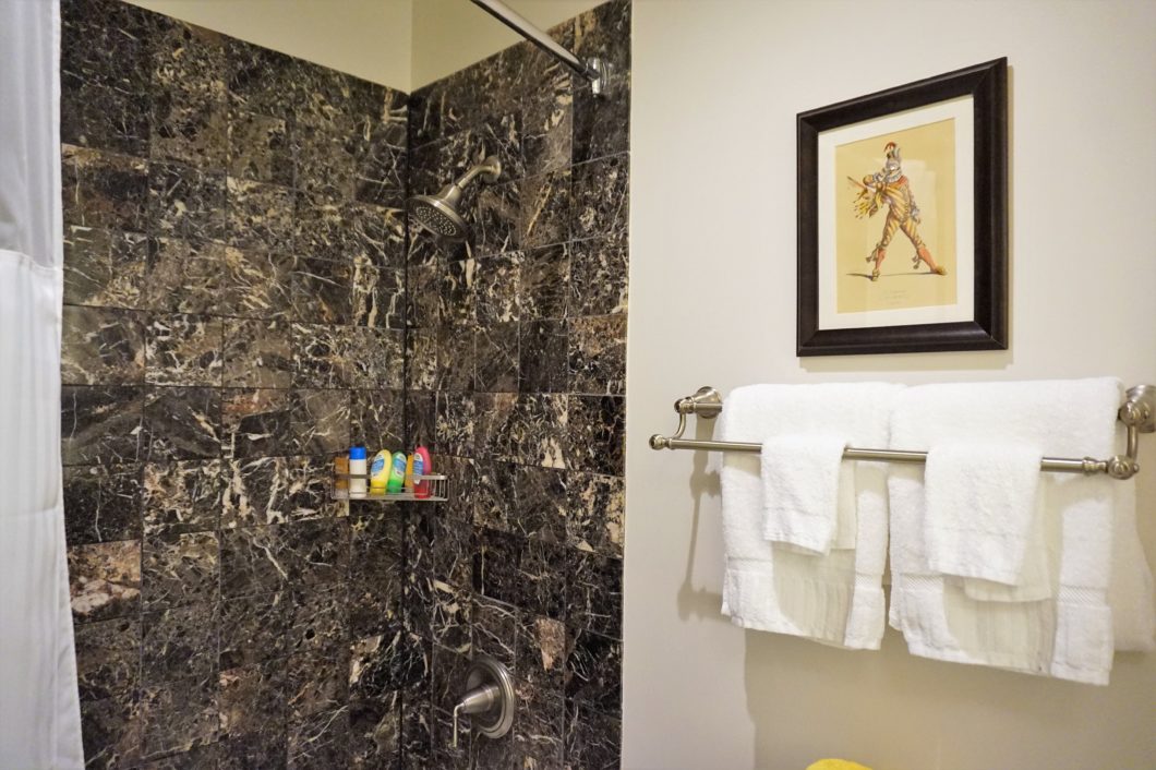 La salle-de-bain est en marbre, un peu petite mais pratique. Notez que vous aurez des petits chaussons et un peignoir à votre disposition.