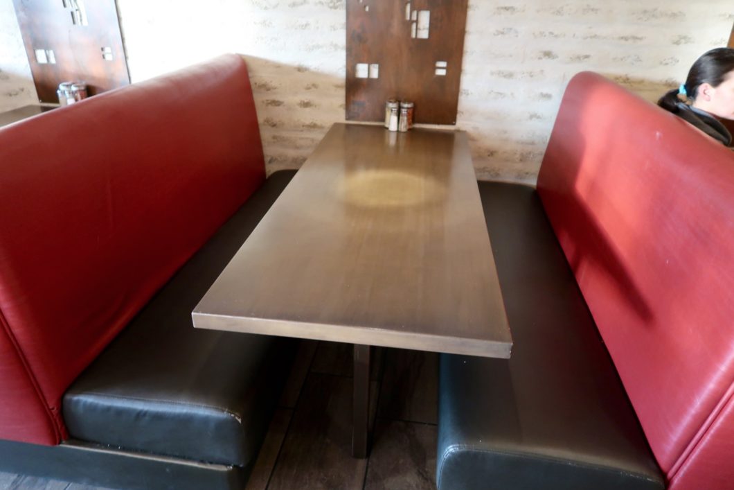 Mais à l'intérieur la décoration est moderne, sobre et soignée, avec une grande salle et ses banquettes confortables et un comptoir pour passer commande