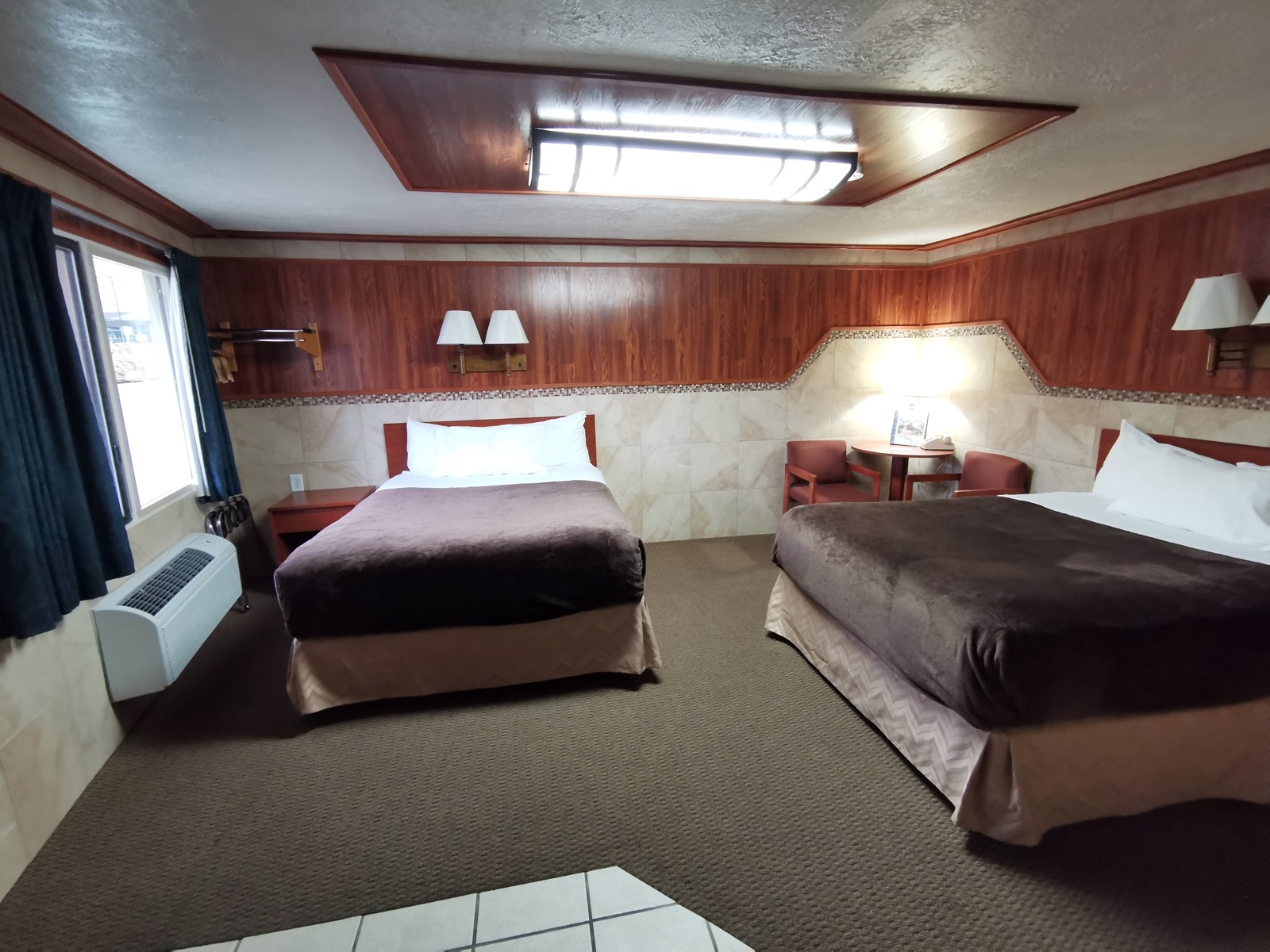 J'étais tout seul lors de ce road trip et j'ai encore eu droit à une chambre immense. Mais il faut l'avouer avec une implantation pour le moins original. Deux grands lits disposés en L. À cela il faut ajouter tous les équipements très utiles : frigo, micro ondes, une grande salle de bain, un petit bureau, que demander de mieux ?! La literie est très confortable. Niveau ménage, car je sais que vous posez souvent la question, la chambre était très propre. La déco n'est pas des plus modernes mais je trouve qu'elle s'accorde bien au reste.